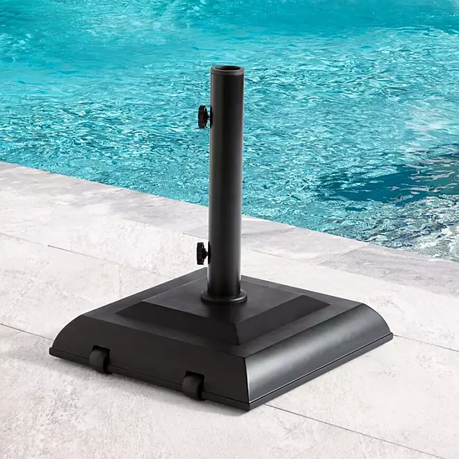 La base de cemento para sombrilla Member’s Mark™ de 60 lb, el tubo superior y el conjunto de tubo inferior se adaptan a un diámetro de poste de sombrilla de hasta 1,88″/4,8 cm, 1,49″/3,8 cm y 1,33″/3,4 cm cambiando el collar para que se ajuste al poste de la sombrilla. Hay dos opciones de altura. Cuando se usa con una mesa de patio, ensambla la base de la sombrilla como la opción de altura más baja ensamblando el collar, el tubo superior y la base de concreto correctos. Puedes colocar la base de la sombrilla debajo de la mesa de patio e insertar la sombrilla a través de la mesa de patio y en la nueva base de sombrilla. Ruedas que facilitan su traslado.
