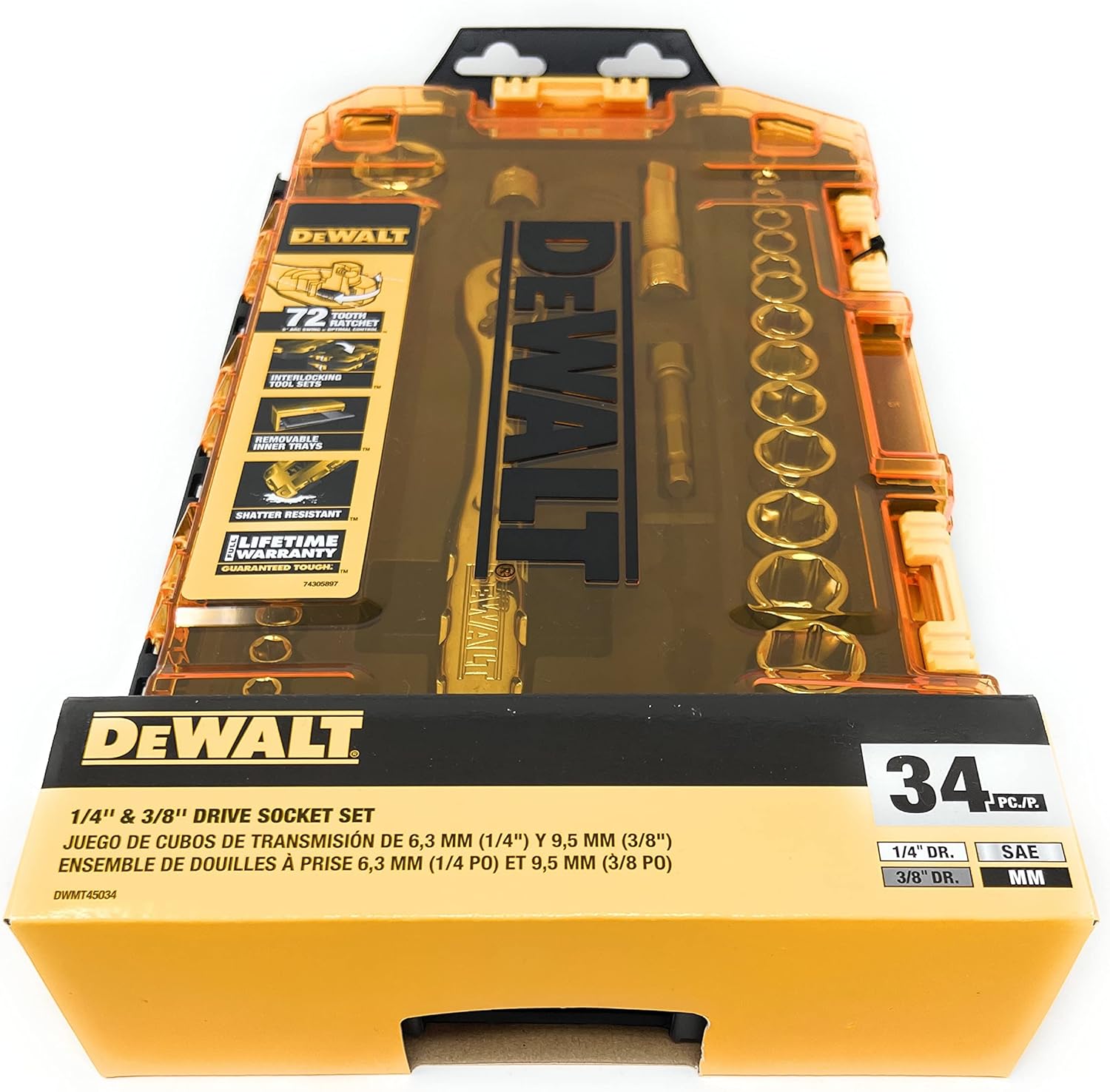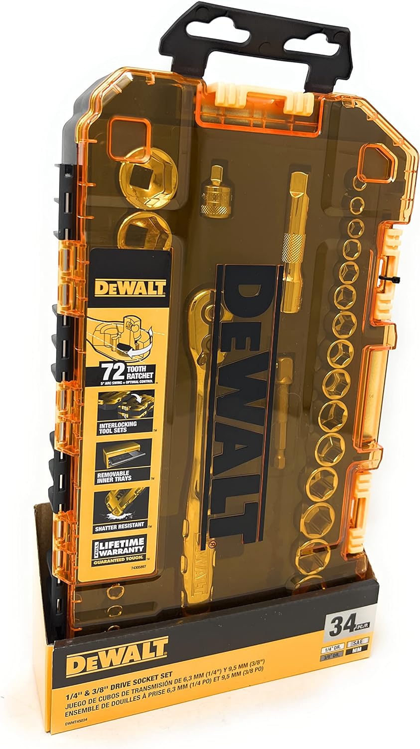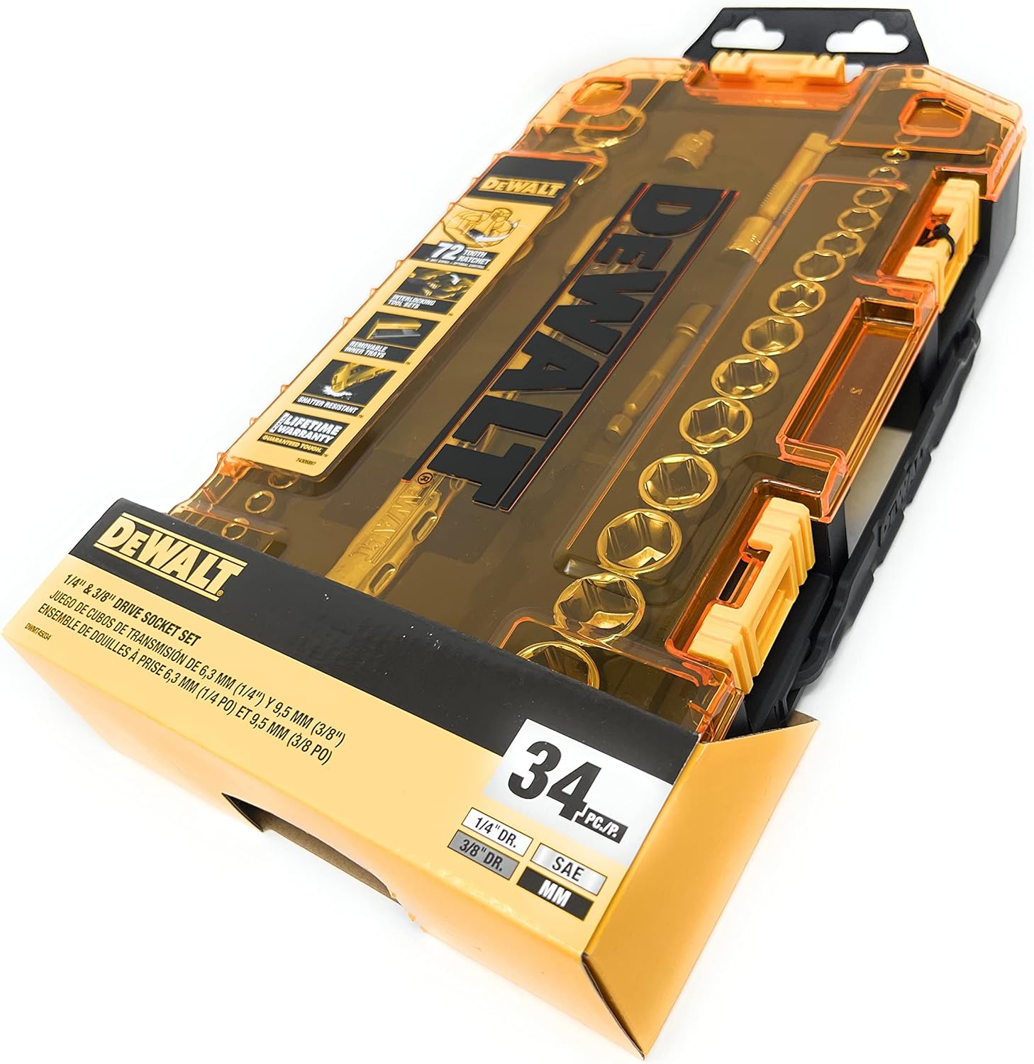 Este juego de dados de 34 piezas es un juego versátil que se puede transportar fácilmente entre áreas de trabajo. Este juego cuenta con una bandeja interior extraíble para adaptarse a la mayoría de los cofres de herramientas con cajones estándar. También tiene bisagras laterales que se entrelazan con conjuntos de herramientas mecánicas DEWALT(R) similares para una solución de almacenamiento organizada. En este juego se incluye un trinquete de 72 dientes, ideal para acceder a lugares difíciles de alcanzar que se encuentran en un lugar de trabajo. Los dados y las llaves tienen marcas estampadas para identificar fácilmente la herramienta que necesita.