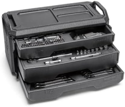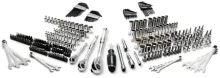 Juego de herramientas mecánicas Husky, ayuda en diversas tareas donde se requiera el uso de tornillos, tuercas y pernos. Cuenta con destornilladores de 1/4 de pulgada, 3/8 de pulgada y 1/2 pulgada que están elaborados en acero con acabado brillante. Consta de 52 herramientas de 1/4 de pulgada, 58 de 3/8 de pulgada, 14 de 1/2 pulgada y 146 de múltiples herramientas; todos estos de diferentes medidas milimétricas y de fracción de pulgada. Las piezas vienen dentro de un estuche plástico negro con bandejas marcadas por tamaño de unidad que permite organizarlas mejor y transportar con seguridad a través de sus asas en la parte superior.