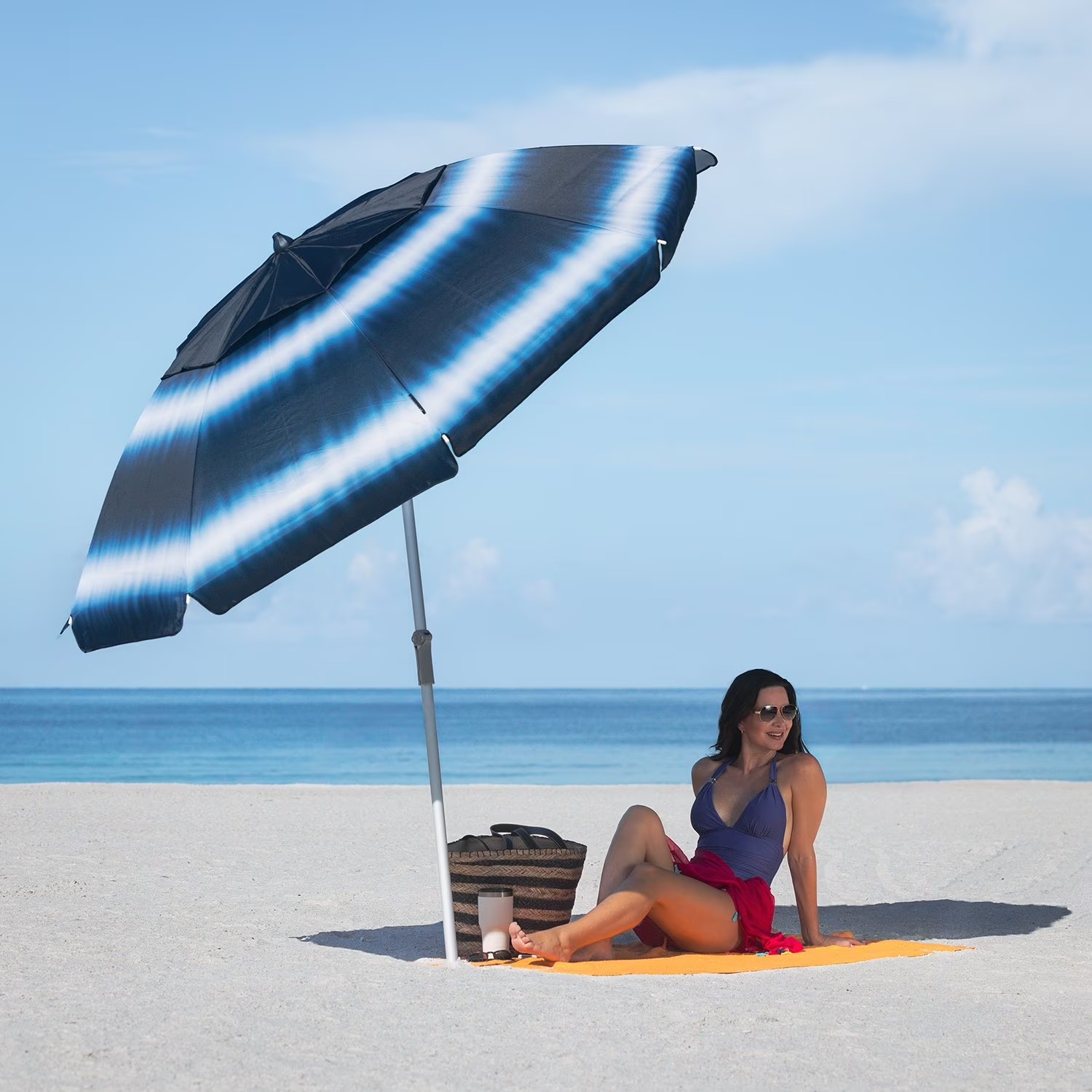 Diseñada con 8 varillas resistentes, esta sombrilla de playa ofrece estabilidad incluso con viento. Su toldo ventilado permite una mejor circulación del aire, evitando que el viento la levante y manteniéndote fresco. El faldón realza la sombra, garantizando una experiencia más cómoda.