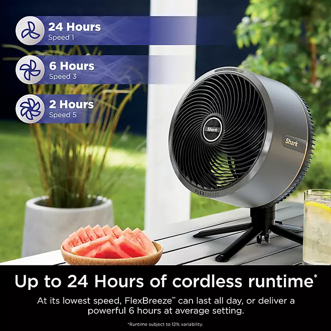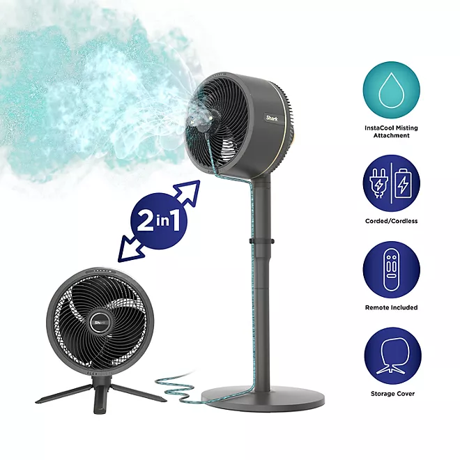 Conozca el ventilador ultrapoderoso Shark FlexBreeze con accesorio de nebulización InstaCool. Inalámbrico y con cable, para exteriores e interiores, se transforma de pedestal a mesa con un alcance de 70 pies y hasta 24 horas de funcionamiento. El accesorio de nebulización InstaCool se conecta fácilmente a su manguera y reduce rápidamente las temperaturas para que se sientan hasta 10 grados más frescas. Increíblemente silencioso, incluso a alta velocidad. Resistente a la lluvia y a los rayos UV para uso en exteriores.