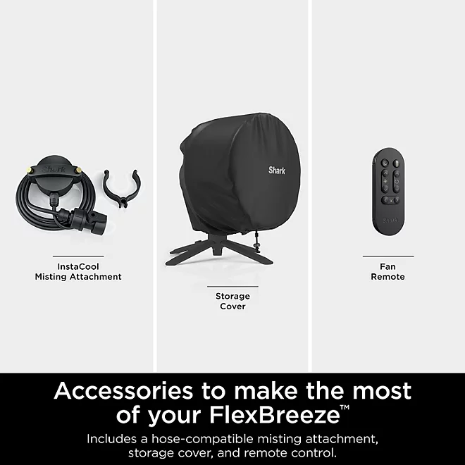 Cabezal de ventilador FlexBreeze, poste de pedestal, base de pedestal, cable de carga, control remoto (batería de botón de iones de litio incluida), accesorio de nebulización, cubierta de almacenamiento.