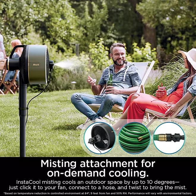 Disfrute de una niebla refrescante inmediata y a pedido: se conecta fácilmente a su manguera y reduce rápidamente las temperaturas para que se sientan hasta 10 grados más frescas*. *Basado en la reducción de temperatura en un entorno controlado a 84 grados, a 9 pies del ventilador y 50 % de humedad relativa. El rendimiento variará según los factores ambientales.
